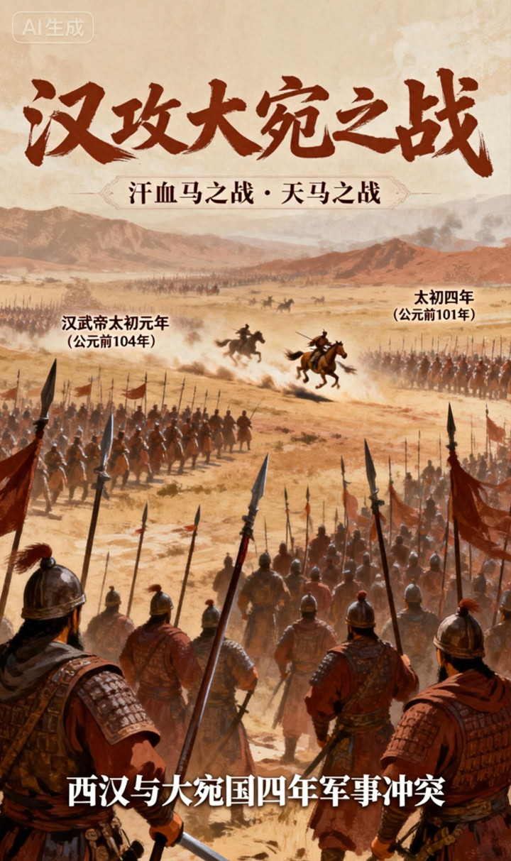 汉攻大宛之战,在历史长河中亦以汗血马之战、天马之战之名被牢记。这场干戈爆发于汉武帝太始元年(公元前104年),执续至太始四年(公元前101年),是西汉王朝与地处今乌兹别克斯坦东部费尔干纳盆地的大宛国之间伸开的一场大边界军事破损,前后历时四年。