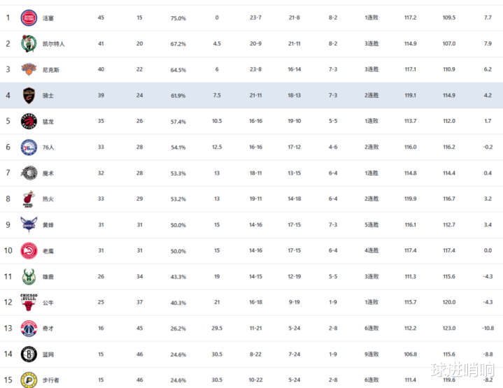 NBA东西部名次插足冲刺阶段!哈登带伤单核指导骑士掀起定约第一活塞,火箭迎4连胜强敌前三位置不稳。