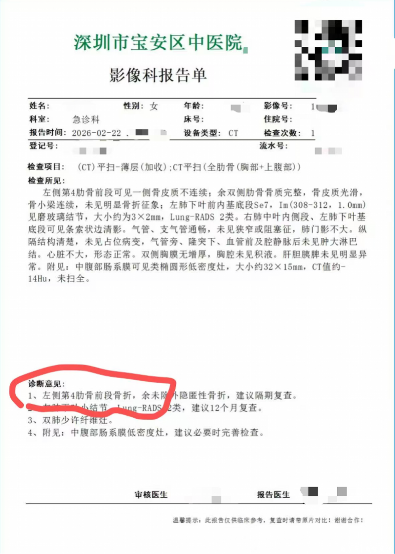 随后,王人女士被送往宝安中病院。经病院查验,王人女士被确诊为左侧第四根肋骨前端骨折。 大夫会诊后奉告:她至少需要60天的收复期。