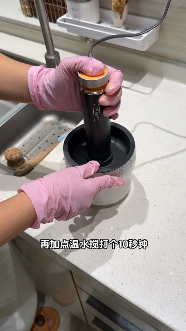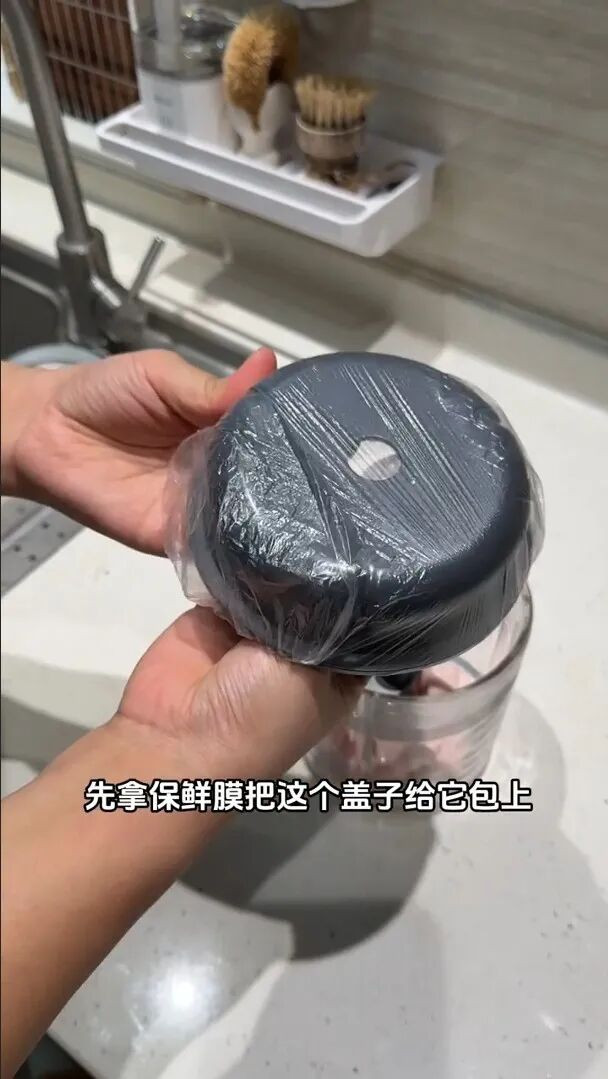 绞肉之前,你先拿保鲜膜把这个盖子包上,认真啊是包盖子,不是包机身。就这样一裹,绞完肉之后阿谁盖子径直扔掉保鲜膜就行,压根毋庸刷。