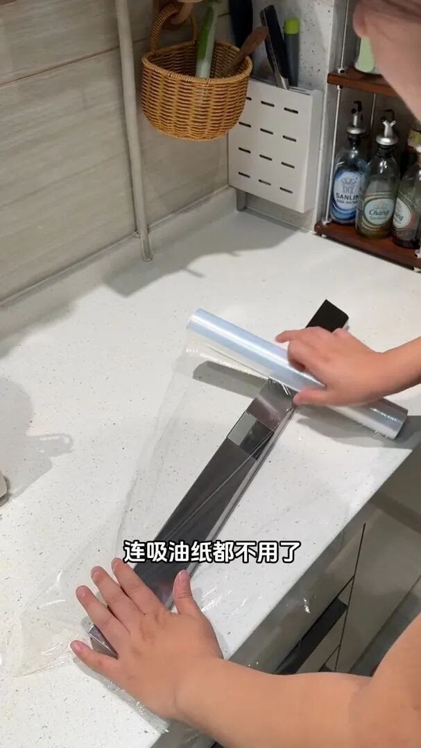 脏了就换呗,厨房纸巾吸满了就扔掉换一张。阿谁保鲜膜呢,阐明情况,半个月一个月换一次。这样一来,这个储油盒恒久都是六根清净的,你倒浑水的本领不会一手油,看着也餍足。