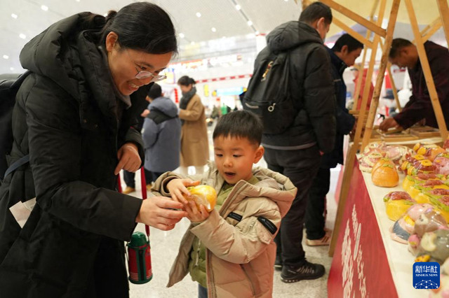 2月10日,在徐州东站,小游客观赏手工花馍。2月10日,在江苏徐州东站,一场“来徐州过大年”举止引诱了不少候车游客驻足围不雅。职责主说念主员现场制作、展示香包、剪纸、汉绣等20余种风气艺术品,营造浓厚的节日氛围,让游客体验到浓浓年味儿。新华社记者毛俊摄