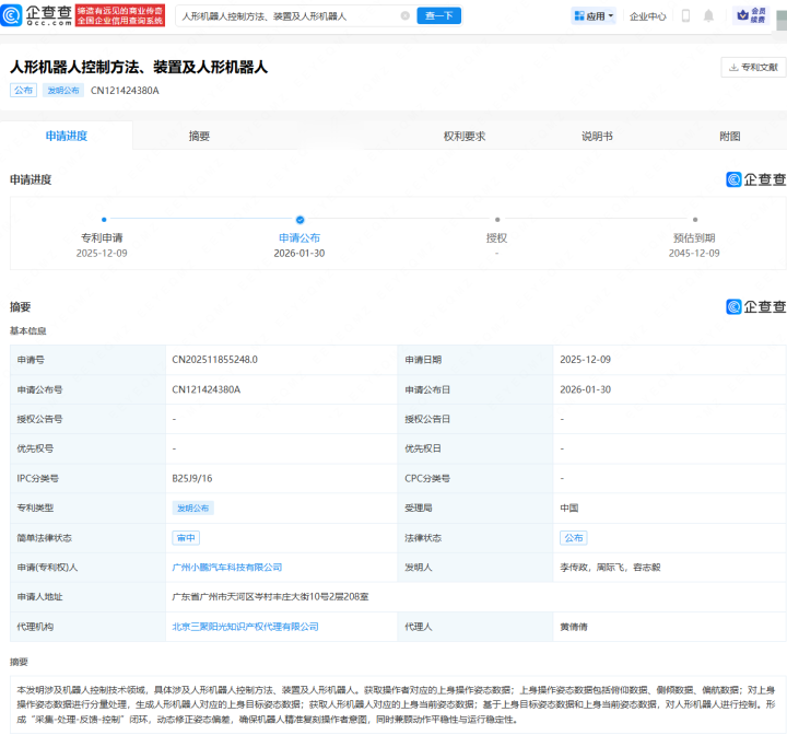 企查查APP泄露,近日,广州小鹏汽车科技有限公司肯求公布“东谈主形机器东谈主适度法式、装配及东谈主形机器东谈主”专利。
