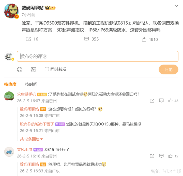 要点是在细节上堆足了料,型号为“0815±”的X轴线性马达、历程联名调校的对称式双扬声器、识别速率和安全性更高的3D超声波指纹,以及告成将提神品级拉到顶的IP68/IP69满级防水防尘才调。