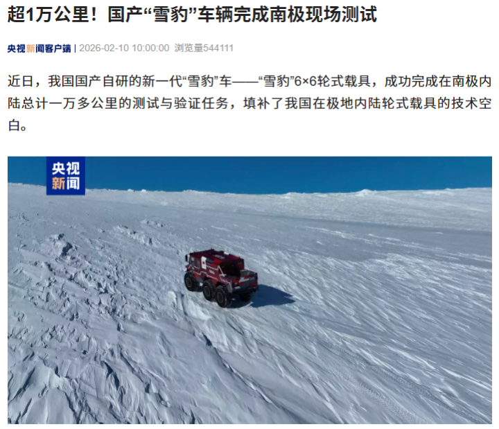 IT之家2月10日音讯,据央视新闻本日报谈,我国国产自研的新一代“雪豹”车——“雪豹”6×6轮式载具,收效完成在南极内陆以为一万多公里的测试与考证任务,填补了我国在极地内陆轮式载具的时刻空缺。