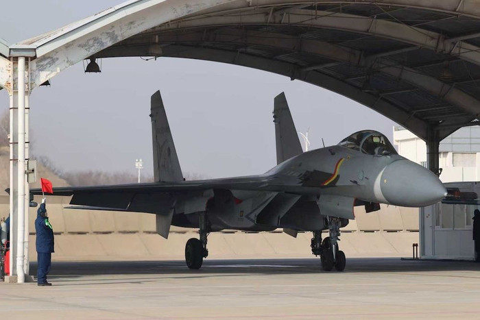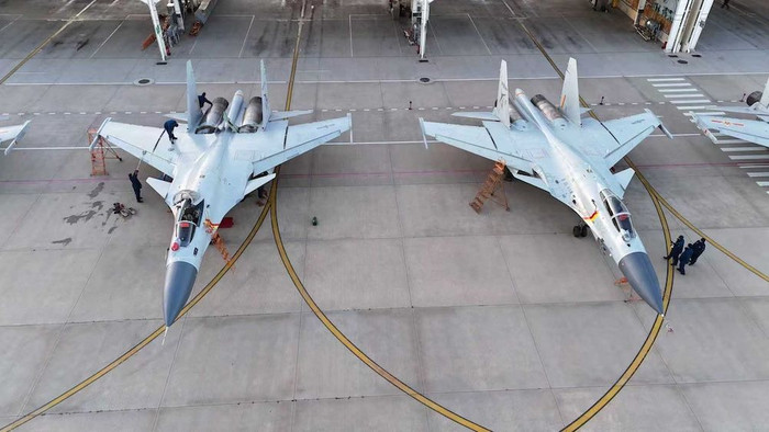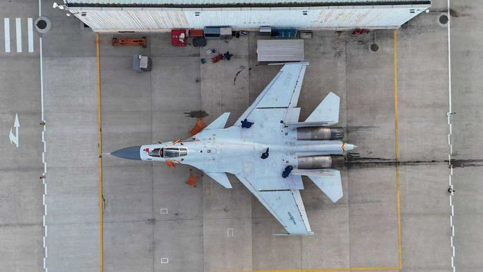 机务东谈主员在对歼-15战机进行风雅休养。