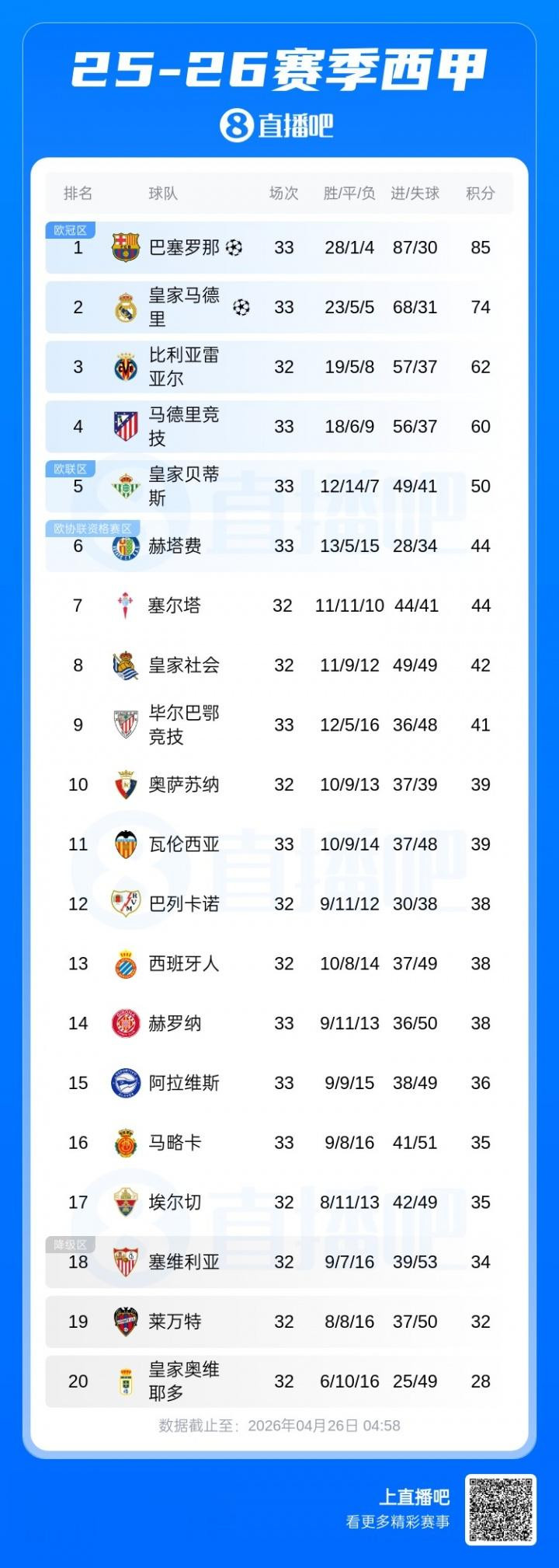 直播吧04月26日讯西甲第32轮,马竞3-2逆转毕尔巴鄂竞技,获取近5轮首胜,驱逐了前4轮联赛的连败。 早些时辰进行的另外一场比赛,巴萨2-0赫塔费,也曾有11分的领跑上风。 最新的积分榜如下↓ 米兰体育官网 开云体育(中国)官方网站...