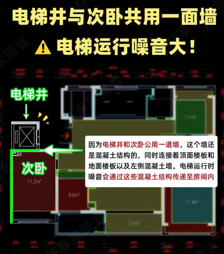 终末一个咱们要遁藏的是卧室紧靠着电梯井的户型,